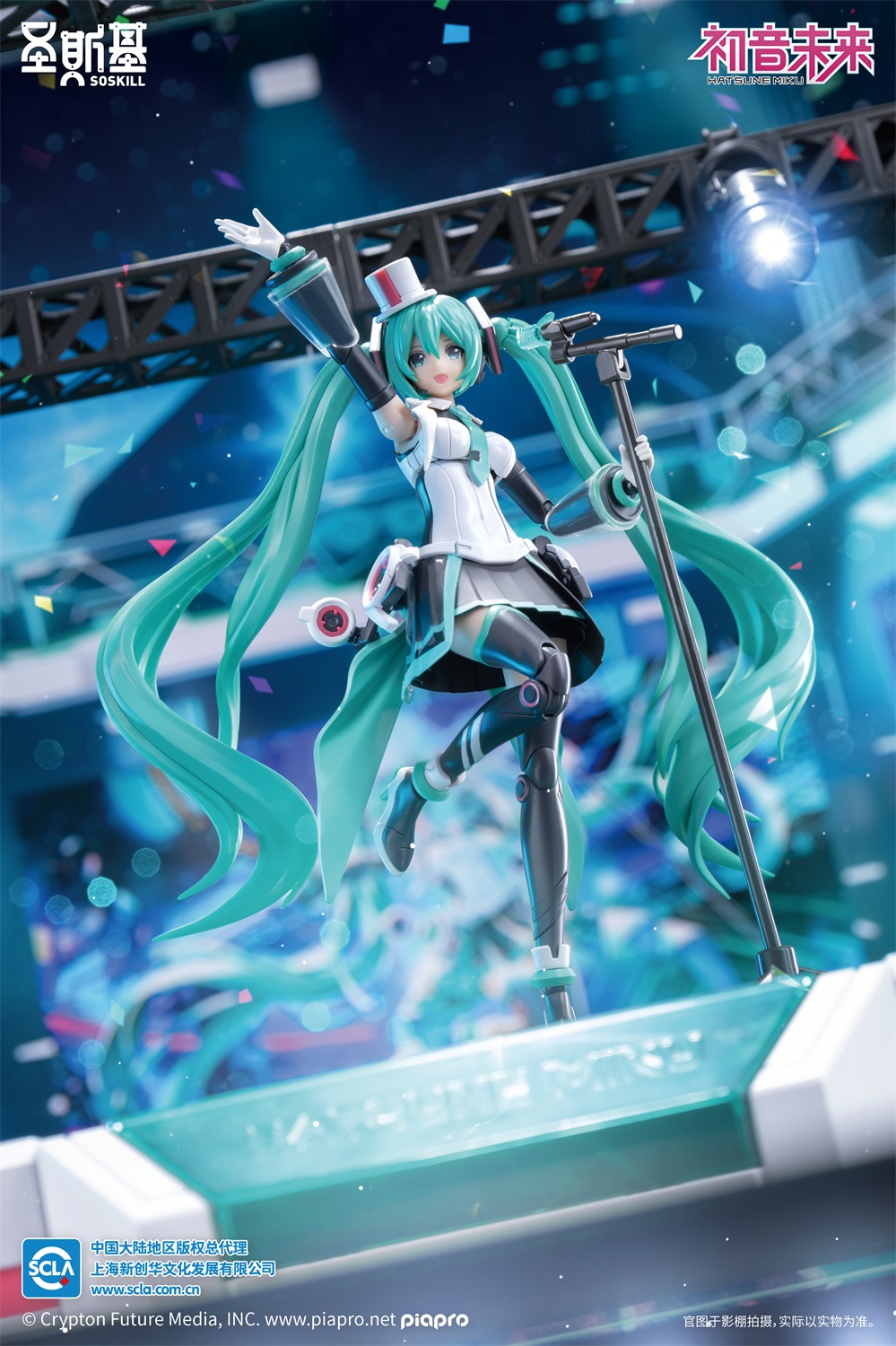 配置:初音未来本体x1、麦克风x1、麦克风支架x1、葱形应援棒x1、衣领替换件x2、打歌服配件x2、演出服配件x2、素体配件x1、手型x6、舞台x1、PE软胶裙子x6片、水贴x1、不干胶x1、替换脸x4、空